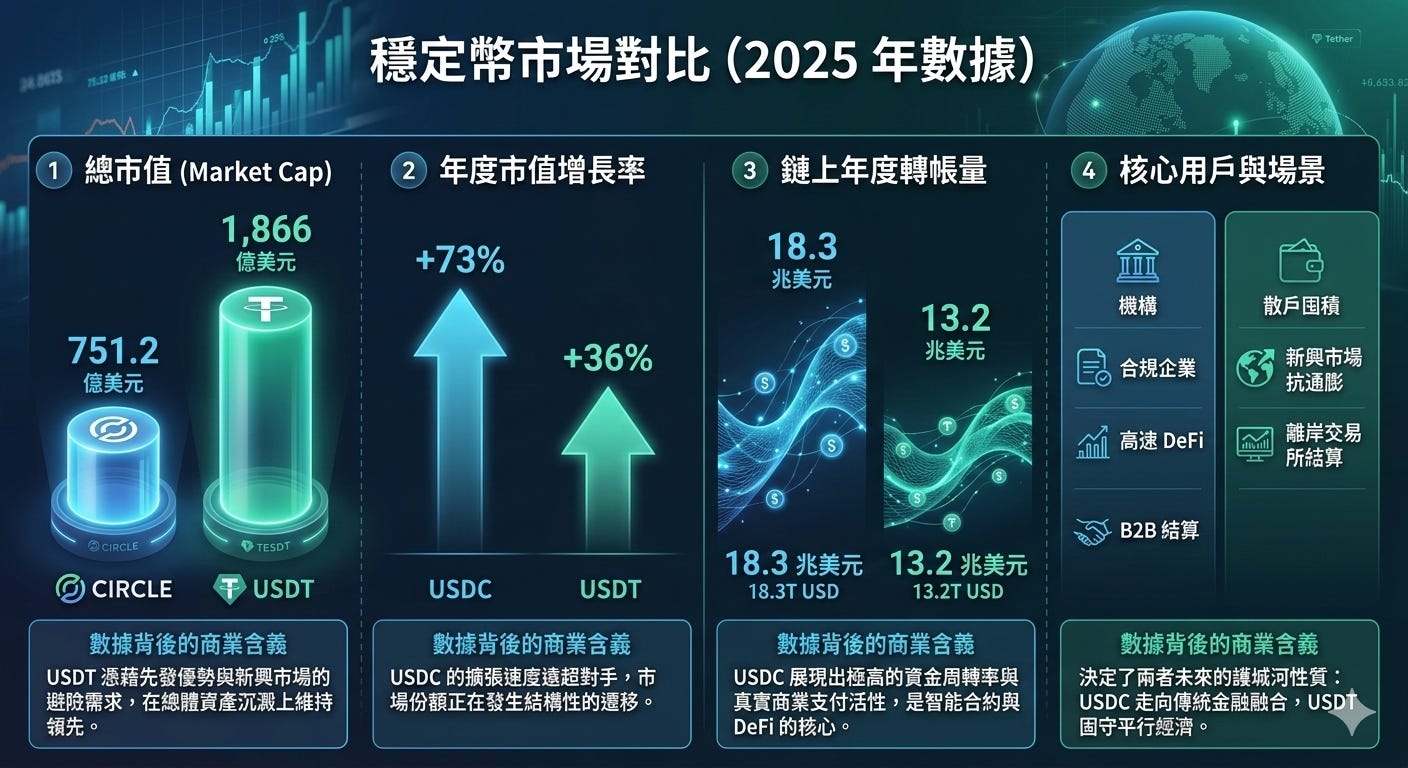 在穩定幣這場具有強烈網路效應、贏家通吃(Winner-take-most)的戰役中,流動性就是絕對的重力。流動性的池子越深,對全球資本與開發者的吸引力就越強。要評估 Circle 的市場滲透率,我們必須將其與最大的競爭對手 Tether (USDT) 進行高解析度的對比分析。