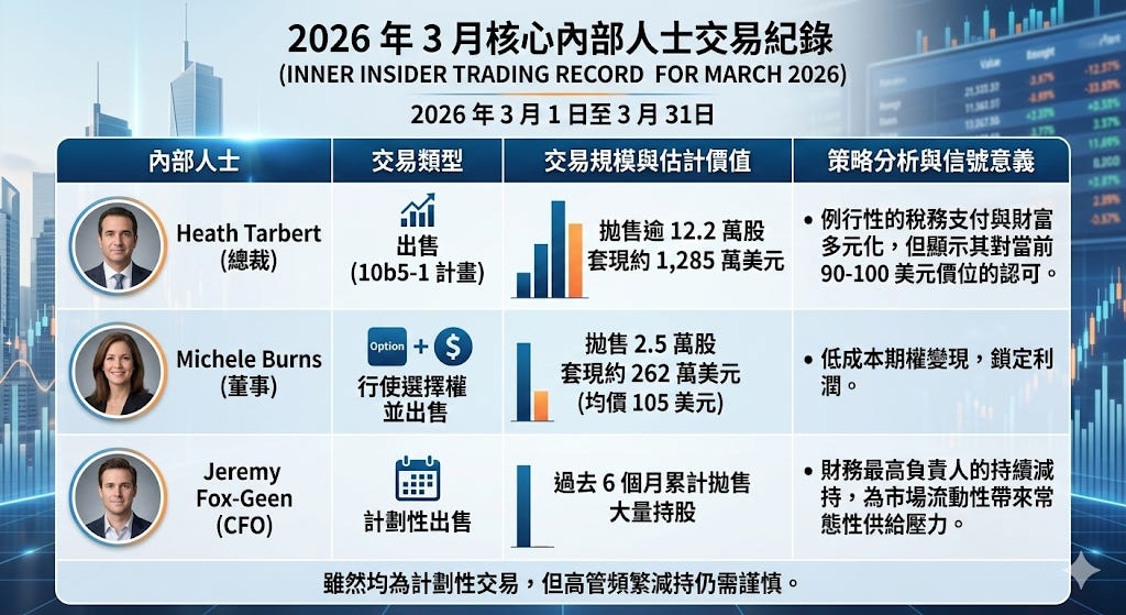 然而,當我們將目光轉向 2026 年 3 月的 SEC Form 4 內部人士交易(Insider Trading)備案時,一個令許多散戶投資者感到不安的冷酷現實浮出水面:管理層正在進行密集的股票拋售。根據披露,Circle 的總裁 Heath Tarbert 在 3 月初透過 10b5-1 交易計畫,在公開市場上以 90 美元左右的均價出售了十幾萬股,套現價值約 1,285 萬美元 。同時,董事 Michele Burns 也在行使了每股僅 0.08 美元的認股權後,立刻在公開市場以約 105 美元的價格拋售了數萬股,獲利豐厚 。此外,包括執行長 Jeremy Allaire 與財務長 Jeremy Fox-Geen 在內的多位高管,在過去 6 個月內皆錄得大量的賣出紀錄,且幾乎沒有任何人在公開市場進行過自掏腰包的買入操作 。