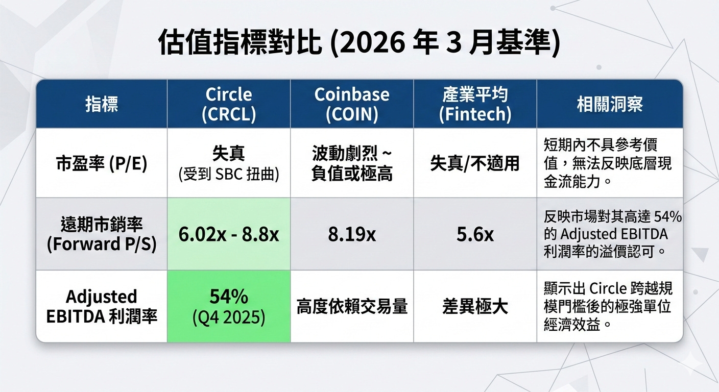 另一方面,市銷率(Price-to-Sales, P/S)則是評估其營收規模市場定價的核心。根據 2026 年 3 月的產業數據,Fintech 領域的平均 EV/Revenue 倍數約為 5.6 倍 。以 Circle 在 2026 年初約 240 億至 250 億美元的市值計算 ,其遠期市銷率(Forward P/S)大約落在 6.02x 至 8.8x 之間 。這一溢價水平,相較於傳統支付巨頭 PayPal(其面臨嚴重的估值倒掛與本益比壓縮,降至約 8.5x 的歷史低點 )顯得極為強勢。同時,若與其最緊密的生態系夥伴 Coinbase 相比,Circle 的遠期 P/S(6.02x)實際上低於 Coinbase 的 8.19x ,這表明在純粹的加密貨幣基礎設施賽道中,市場認為 Circle 依賴利息與儲備金的「收租」模式,相較於 Coinbase 高度依賴零售交易量波動的手續費模式,具有稍微低一點的估值風險與更強的穩定性。