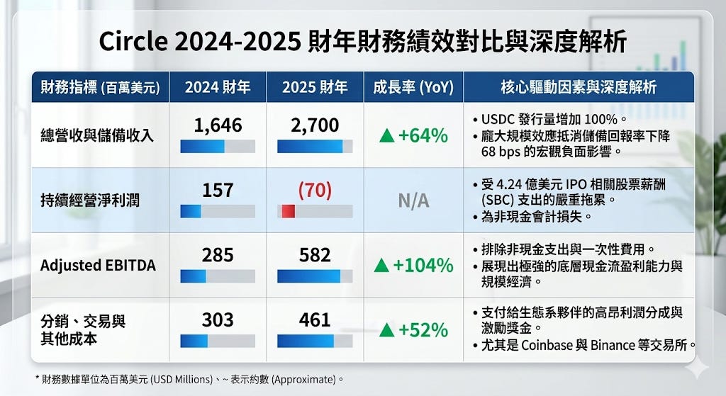 概覽 2025 年第四季度與全年的財報,展現了一種「爆發式增長」與「結構性陣痛」並存的複雜局面。從宏觀數據的表象來看,這是一份無可挑剔的成績單。2025 全年總營收與儲備收入達到了 27 億美元,年增長率高達 64%;而 2025 年第四季度的總營收更達到了 7.7 億美元,年增長率高達 77% 。這種頂線(Top-line)增長的速度,在當前總體經濟充滿不確定性的環境下,顯得極為罕見。更令人振奮的是其利潤修復的能力:2025 年第四季度的持續經營淨收入達到了 1.33 億美元,Adjusted EBITDA 高達 1.67 億美元,利潤率達到了驚人的 54% 。這份數據無可辯駁地證明了,當 IPO 的一次性股票薪酬費用攤提告一段落後,Circle 的核心業務具備著猶如印鈔機般的強大自由現金流產生能力。
