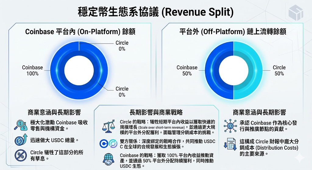 然而我必須直言不諱地指出,Circle 完美商業模式中最大的一個「出血點」(Value Leak),在於其與 Coinbase 之間簽署的長期分潤協議。這不僅僅是財務報表上的一筆龐大支出科目,更是理解當前數位資產基礎設施權力結構的一把鑰匙。